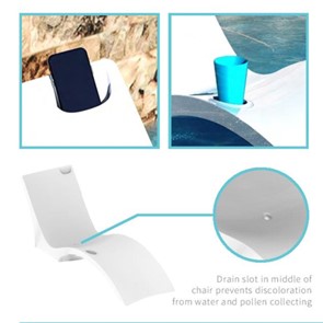 Description: Molded chaise lounge with integrated cup and cell phone holder, easy to fill hose hole located on the back of chaise allows for simple filling and draining, anti rocking base design, UV16 rating, 16000hours/10 years of direct sunlight protection, Sunlounger, Pool Shelf Lounger