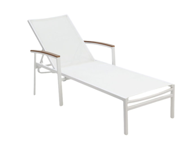 Frame Finish: Powder coated aluminum with sling and teak or faux teak arm caps