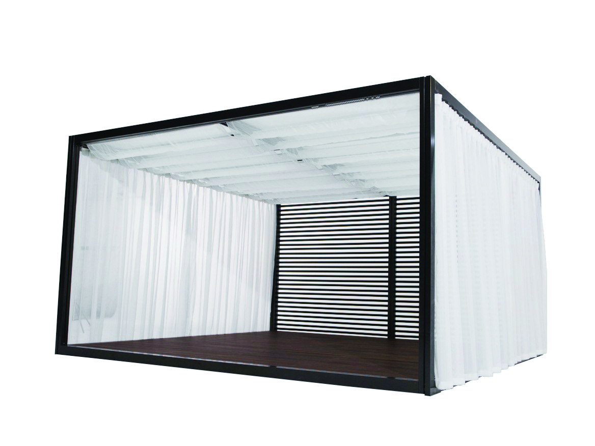 Roof: ALU stationary louvered panel or PC roof + sliding drapery with baton